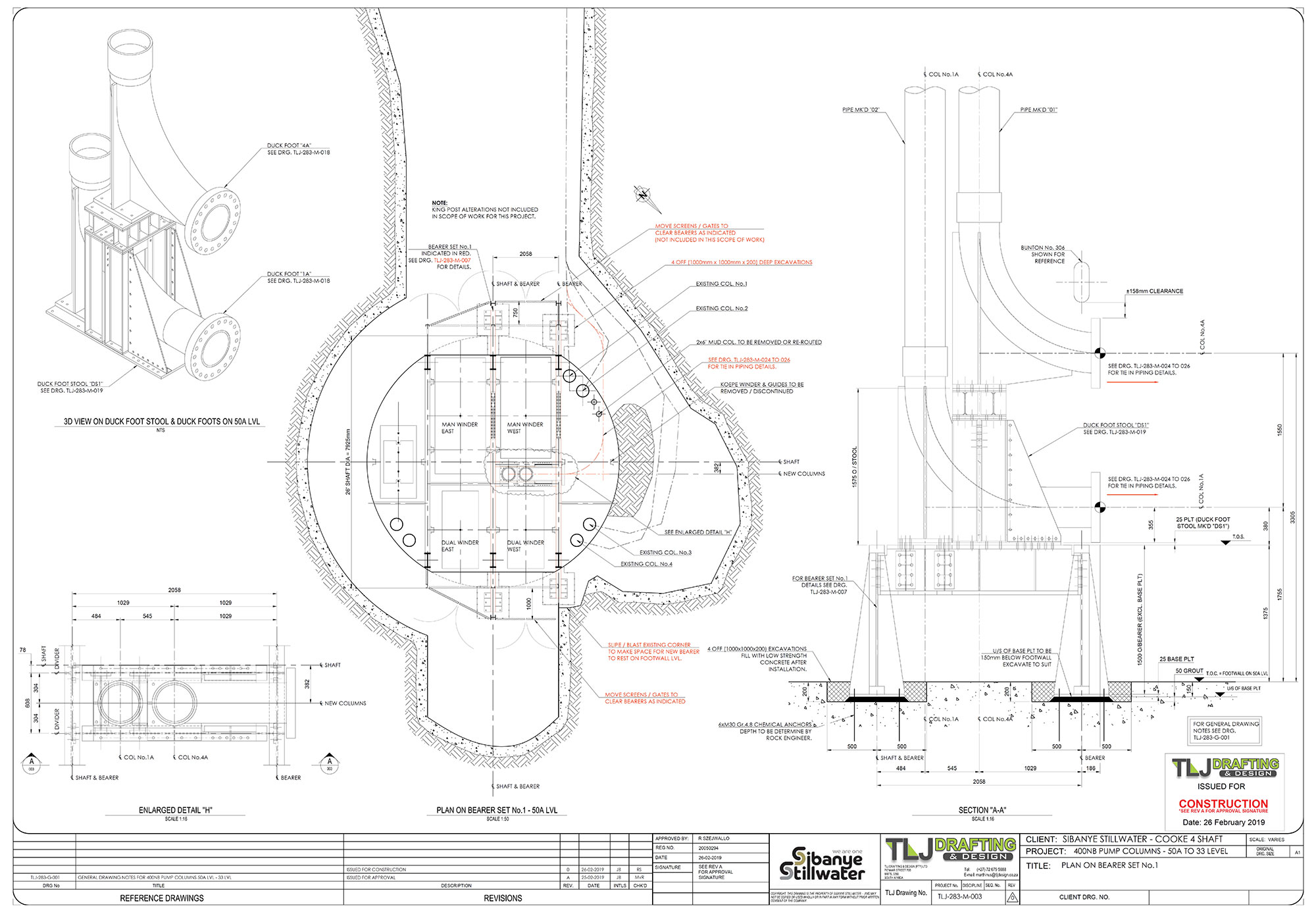 In order to keep old shafts safe & profitable, major mining companies in South-Africa is replacing corroded shaft steelwork at a rapid pace.  Most old shafts only have GA drawings, thus manufacturing shaft steelwork especially in shaft bottoms, can become very complicated.  TLJ specializes in shop detail drawings of shaft steelwork.  One of our largest shaft steelwork projects contained in excess of 100 A1 size detailed shop drawings and took nearly 2 years to complete.  Manufacturing & installation started as the first sets of drawings was delivered.Â